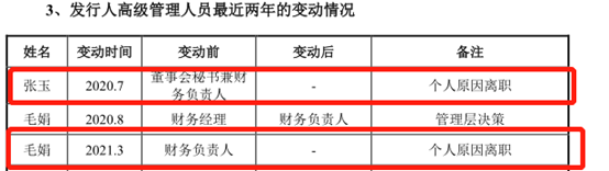 有意思的是,2020年7月,张玉因个人原因离职,随后担任鸿晔科技财务负责人的毛娟也于2021年3月离职。那么,为何鸿晔科技连续两任财务负责人相继离职?