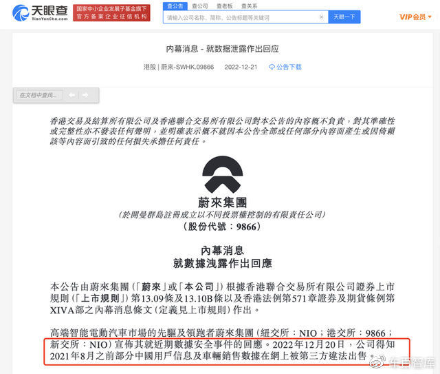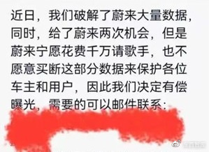 一张流传于网络的图片显示,有人通过网络攻击,“破解了蔚来大量数据”,或因勒索不得而公开出售。该图片显示,所售数据包括车主身份证、用户地址等信息,另外,车主亲密关系、贷款数据等信息也在出售之列,这些信息多为车主隐私。