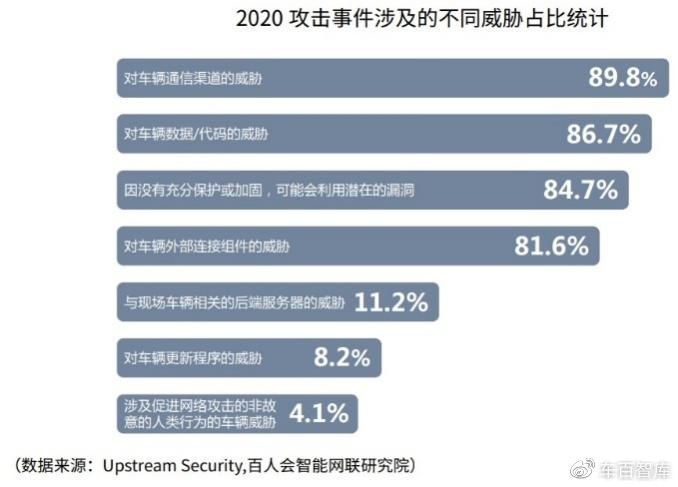 据Upstream Security的数据,2011年-2020年,针对智能汽车的网络攻击事件,发生了633起,近86.7%威胁到车辆数据和代码,近43%威胁到车辆控制,这些都可能导致正在行驶的汽车被远程操控、车辆功能被远程控制,进而危害交通和个人安全。