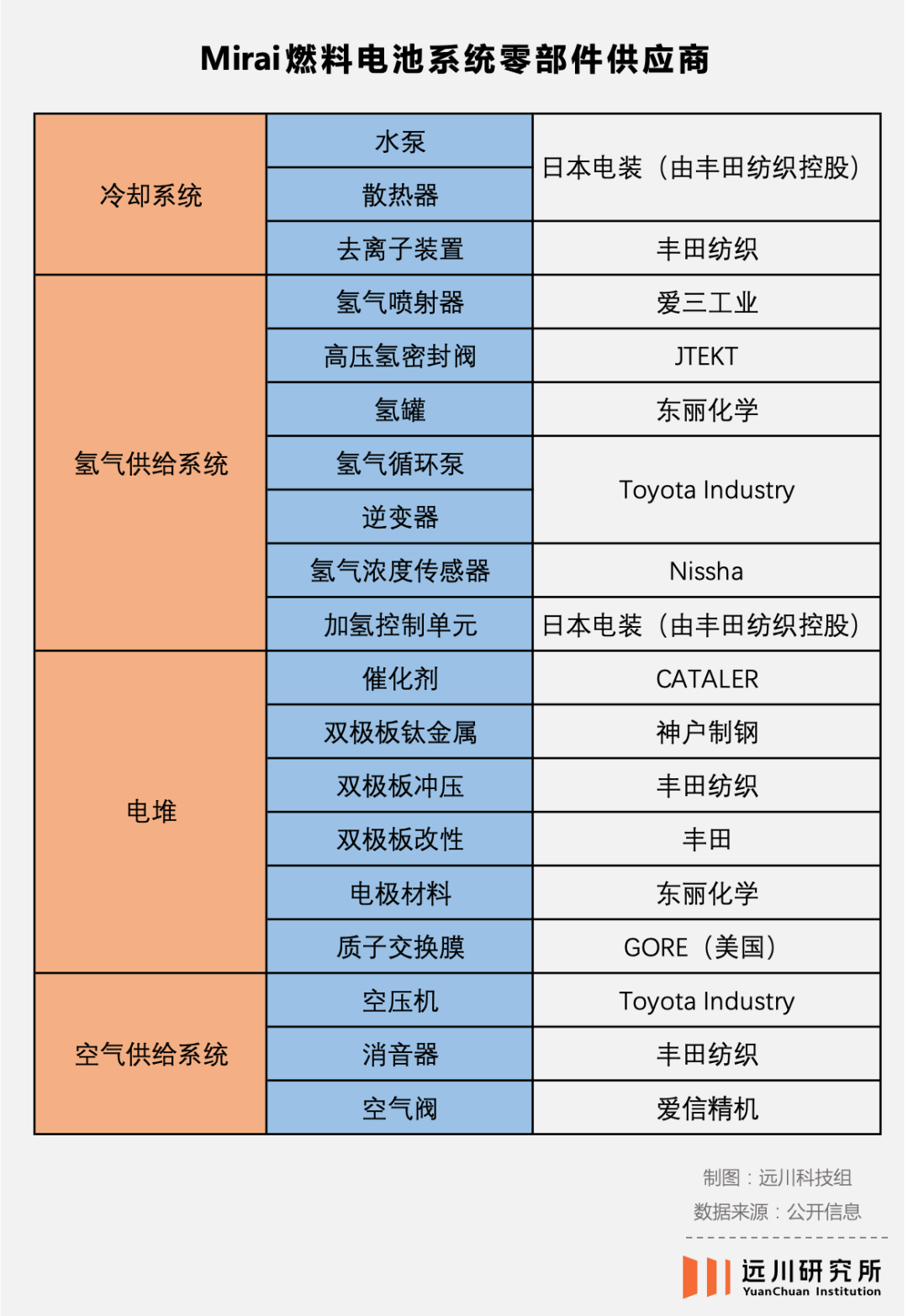 Mirai的燃料电池系统零部件供应商几乎完全来自日本,甚至不少公司就是丰田的子公司。汽车业往往有复杂的客户认证过程,成为认证供应商基本需要2到3年时间。正是由于过程繁琐,车企选定了供应商就不会轻易更换,新企业入行成本很高。