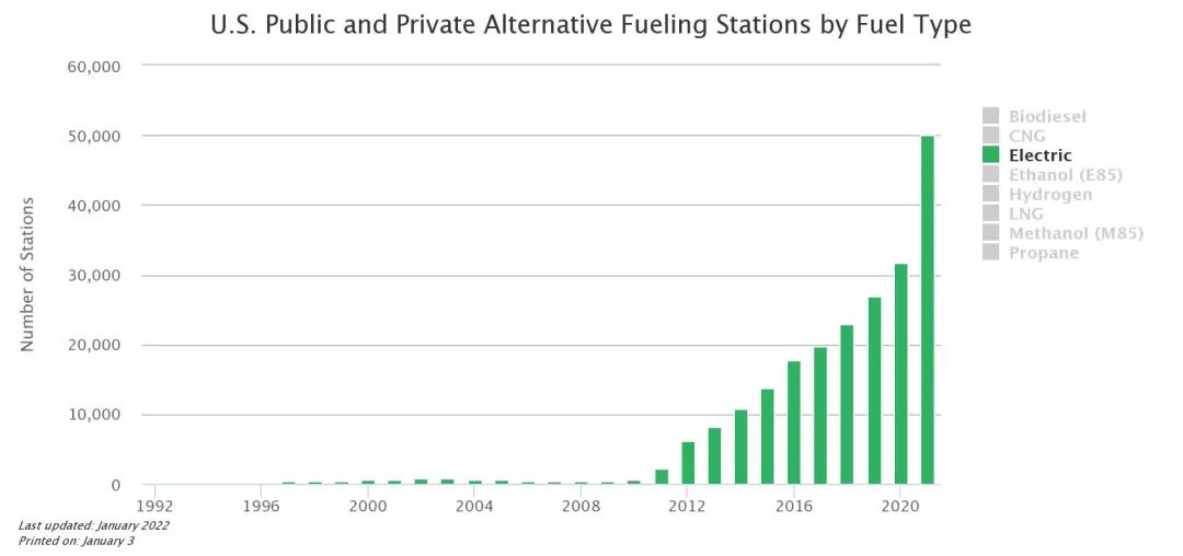 纯电车似乎也会遇到充电桩密度的问题,但即使是在电动车渗透率非常低的美国,充电桩的建设速度也远远超过了加氢站。