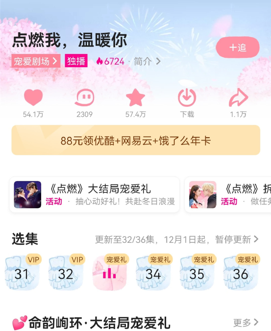 电视台to B端的影响力减弱,使得视频平台方面则需要加大营销补充,诸如《点燃我,温暖你》在网络发酵至最高热度时,德塔文景气值达到1.7+,实现圈层火热,平台开通“命韵峋环·大结局宠爱礼”,会员付费购买福利同时可以超前观看大结局,却也因客观因素未能展开营销侧助力,最终也未能一举破圈,实属遗憾。