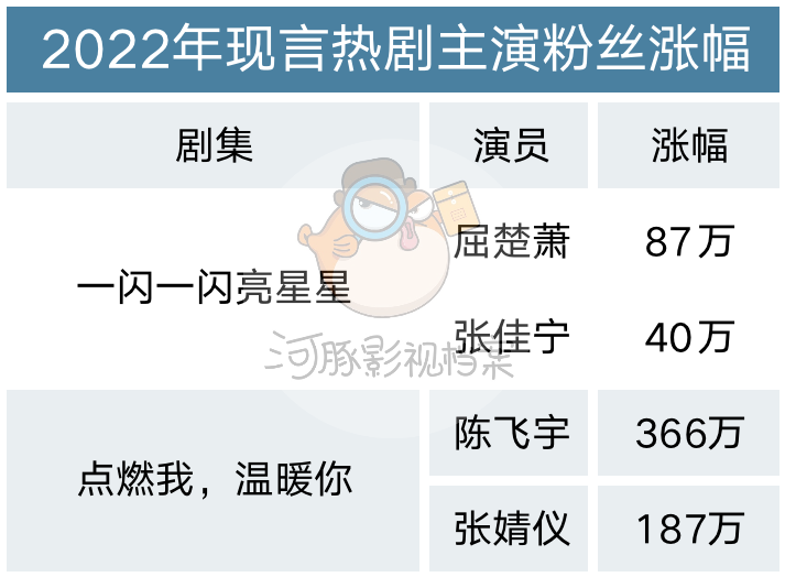 但2022年两部最为火热的现言剧是年初的《一闪一闪亮星星》和年末的《点燃我,温暖你》,其中两对男女主微博粉丝数有不同数量增加,最多的是陈飞宇单月涨粉366万,不过制片人叶子透露暂时没有收到四人片酬有较大涨幅的消息。