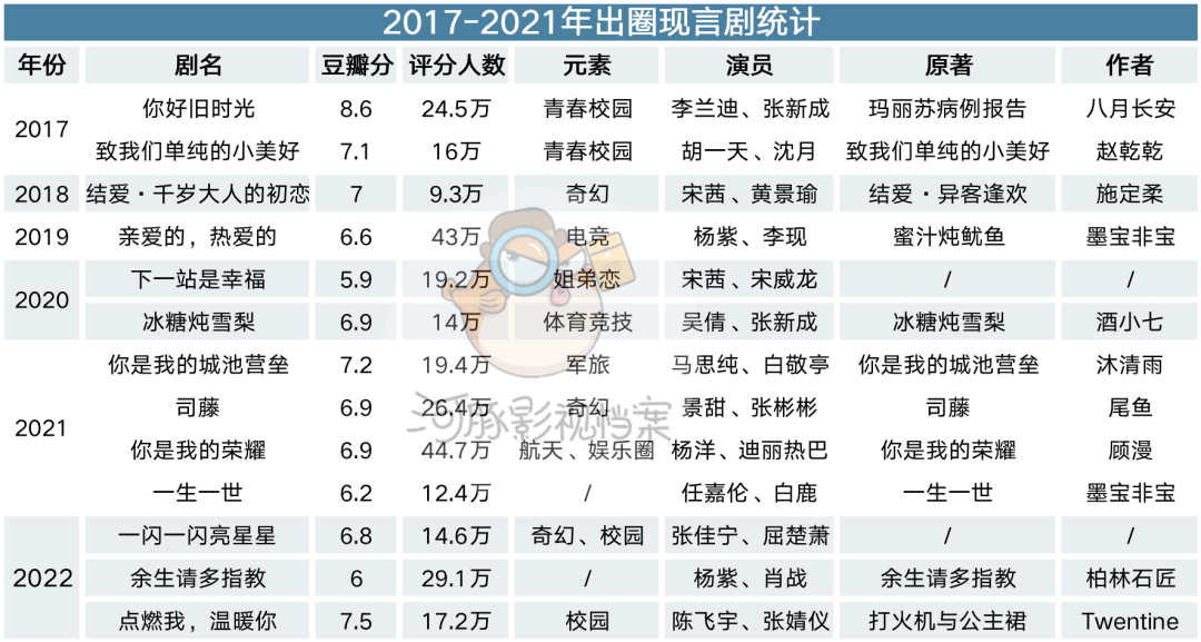 河豚影视档案统计了2017年至今,每年最高热的几部现言剧,根据打分人数也可以大致感受到,人数达20万以上的几部才算是真正出圈之作,人数达40万以上的全民爆款在六年间仅有两部:分别是根据墨宝非宝《蜜汁炖鱿鱼》改编的《亲爱的,热爱的》,以及顾漫同名小说改编的《你是我的荣耀》。