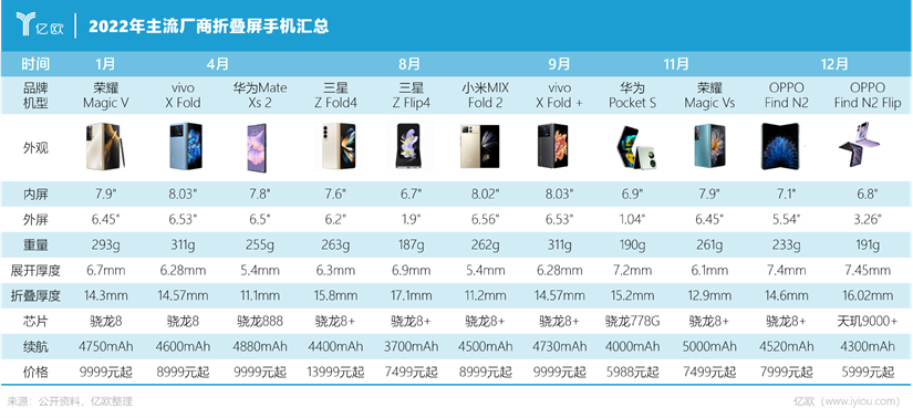 从年头荣耀发布家族首款折叠屏手机Magic V,到年尾OPPO“一炮双响”推出Find N2及Find N2 Flip,2022年国内主流手机厂商推出的折叠屏产品合计已达十余款。尤其是下半年,基本上每个月都有折叠屏新品的爆料。