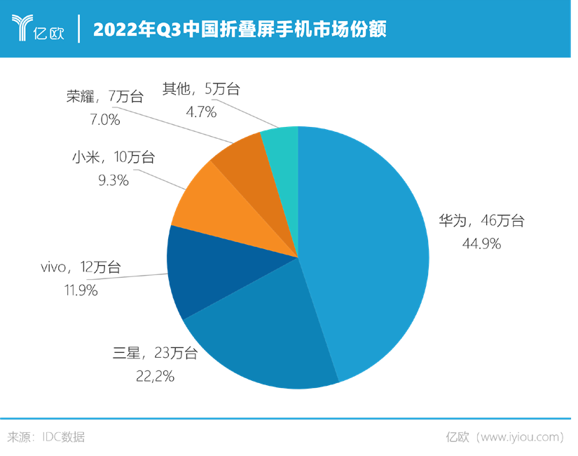根据IDC的统计数据,2022年第三季度,国内折叠屏手机市场份额排行Top5分别是华为、三星、vivo、小米、荣耀。其中,华为的市场份额高达44.9%,三星的份额为22.2%,两者合计可以碾压其他所有对手。