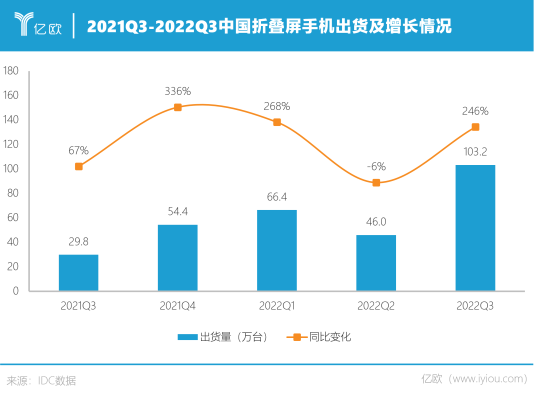 来自IDC的最新统计显示,在最近的5个季度,国内智能手机出货量不断下滑,但折叠屏手机的出货量却在井喷式爆发。尤其是在2022年第三季度,中国折叠屏产品出货量超过100万台,同比增幅约246%,创造了有史以来最大单季出货量。