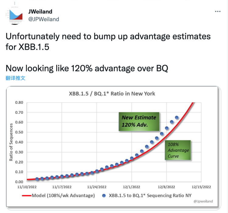 半个月后,JP Weiland发推感叹,“看起来XBB.1.5将会终结BQ.1。”