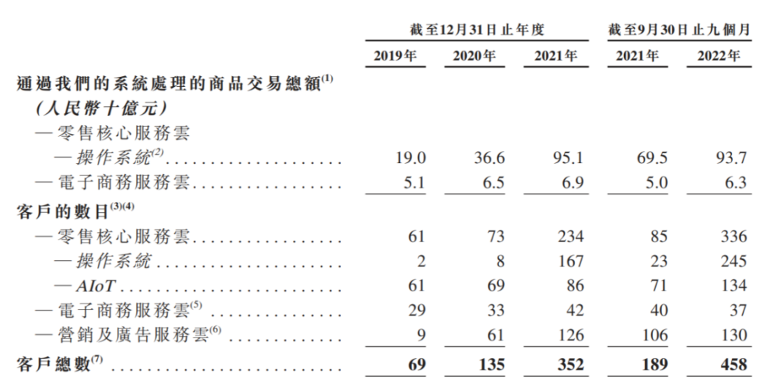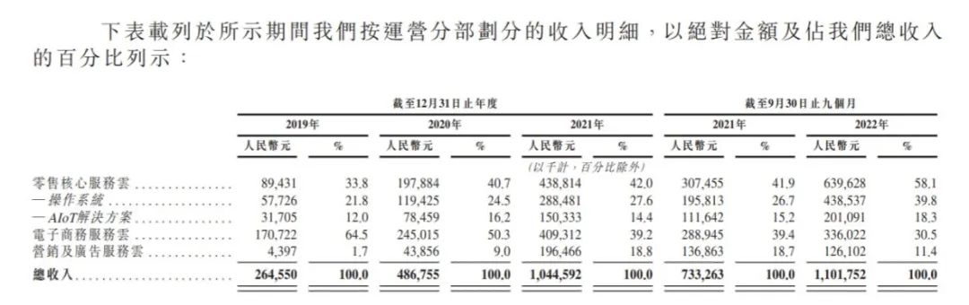 招股书显示,在收入构成中,电子商务云占比由2019年的64.5%降至2022年的30.5%,零售服务云占比逐年提升,已经由33.8%提高至58.1%。