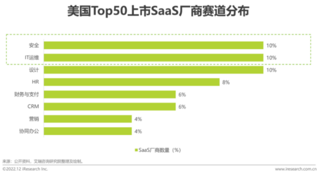 根据艾瑞报告最新发布的《2022年中国企业级SaaS行业研究报告》来看,美国Top50上市SaaS厂商赛道呈现着与中国南辕北辙的态势:安全、IT运维和设计类的SaaS厂商并列排在第一梯队,各占10%;协同办公、营销、CRM排在最后一梯队,分别占4%、4%和6%。