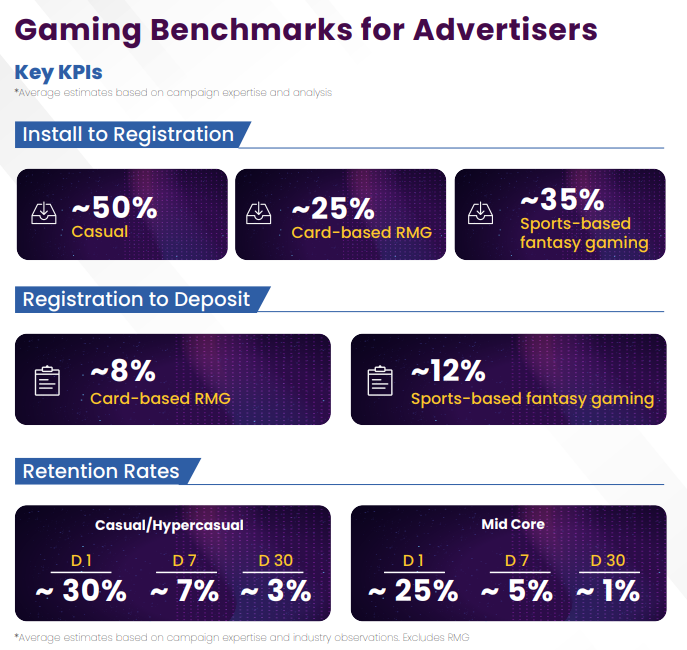 其五,对于印度手游来说,休闲游戏、卡牌真金游戏、梦幻体育游戏从“安装”到“注册”的转化率分别约为50%、25%、35%,后两者从“注册”到“充值”的转化率分别约为8%和12%。对于超休闲/休闲游戏,次留约为30%,七日留7%,中重度游戏则是25%和5%。