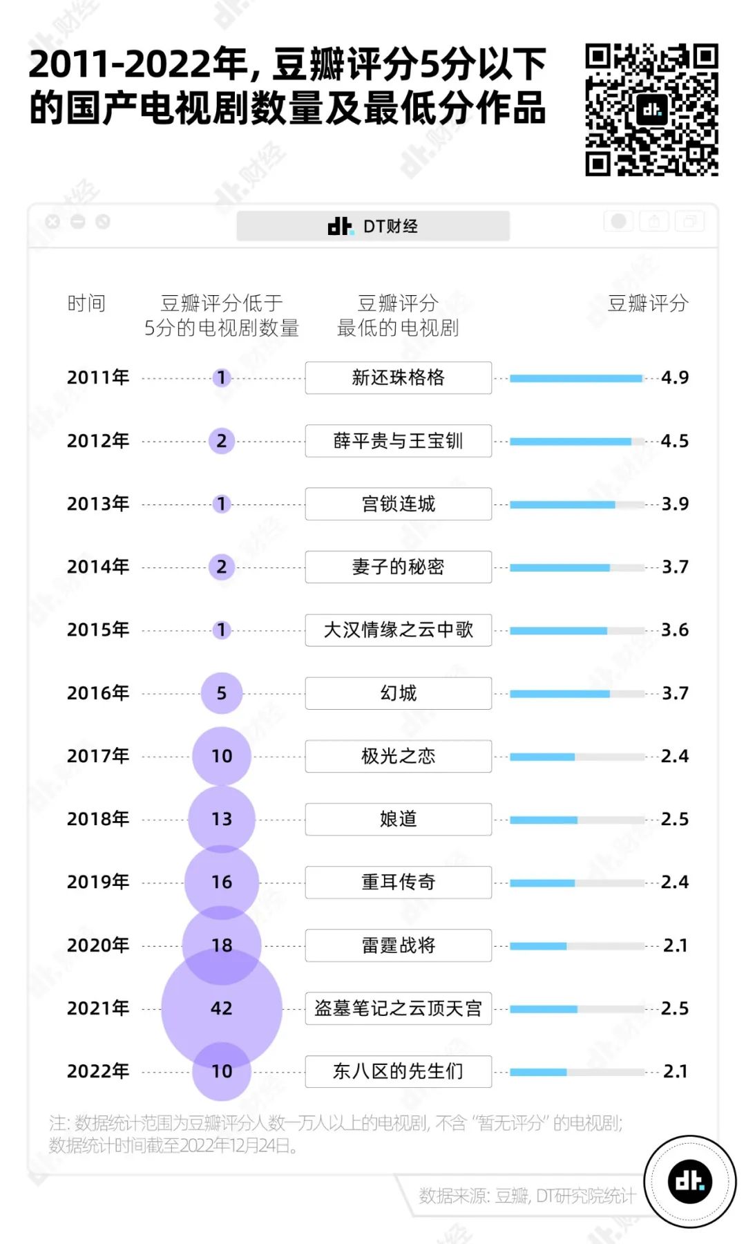 第一部低于5分的国产烂剧《新还珠格格》,最早出现在2011年(作品总数31部)。10年后,2021年,低于5分的作品有42部(作品总数139),数量和占比都到达顶峰。