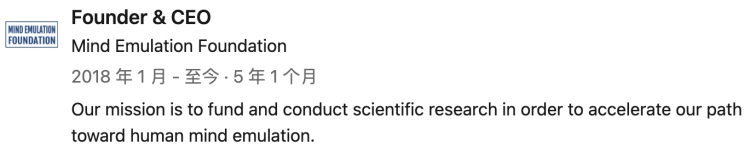 谁又能说,未来这些“可能”里没有人的记忆呢?“巧”的是,在Siroker的LinkedIn主页,写着他曾在2018年创办了一个基金会,至今还在运营,而这个基金会的设立正是为了“资助和开展科学研究,以加快我们走向人类全脑仿真(mind emulation)的道路”。