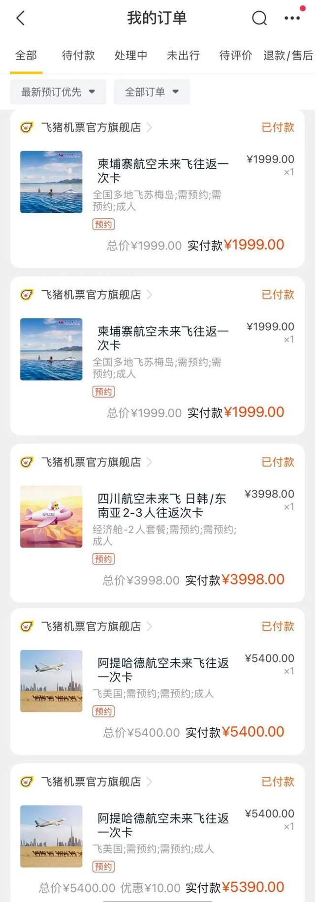 光是囤机票,她就花了近2万元,“包括1999元的柬埔寨航空往返一次卡两份,四川航空的东南亚往返2人套餐3998元,5400元的阿提哈德航空的美国往返一次卡两份。”
