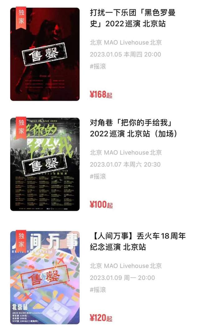 “预售票都是一开票就抢光了,圈内热门乐队更是一票难求。”摇滚乐迷张煦告诉开菠萝财经,他从上个月就密切关注起MAO、疆进酒、乐空间等北京各大livehouse的动态,做好了抢票准备。