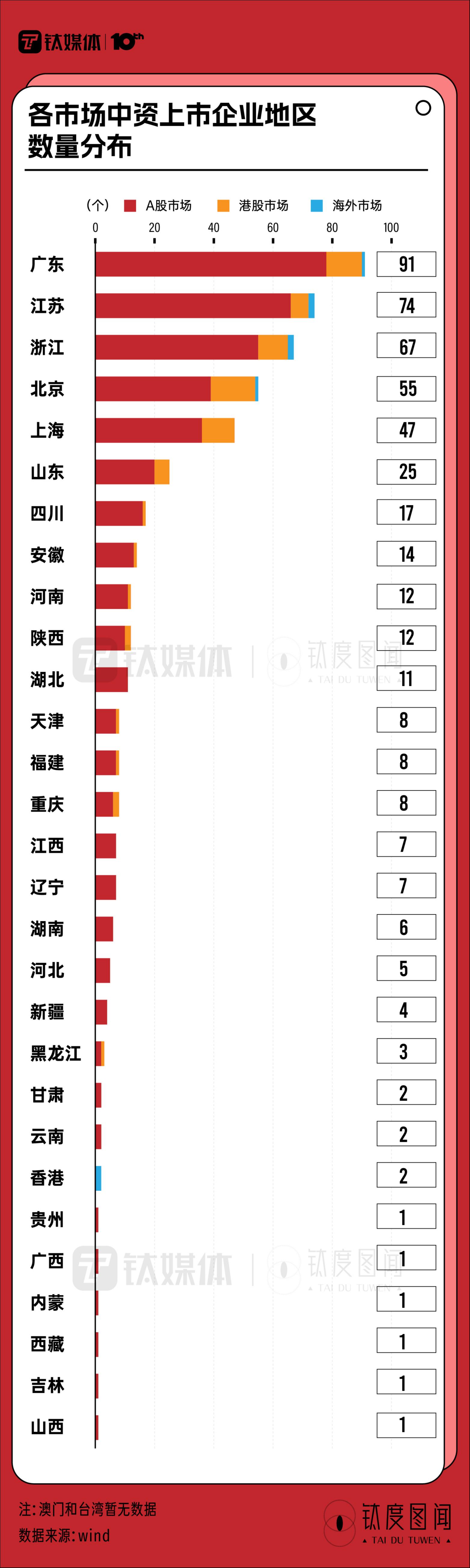 在A股市场中,来自广东的上市中资企业数量最多,达78家;在港股市场中,来自北京的上市中资企业数量最多,达15家;在海外市场的中资上市企业来自6个地区,数量差距不大。