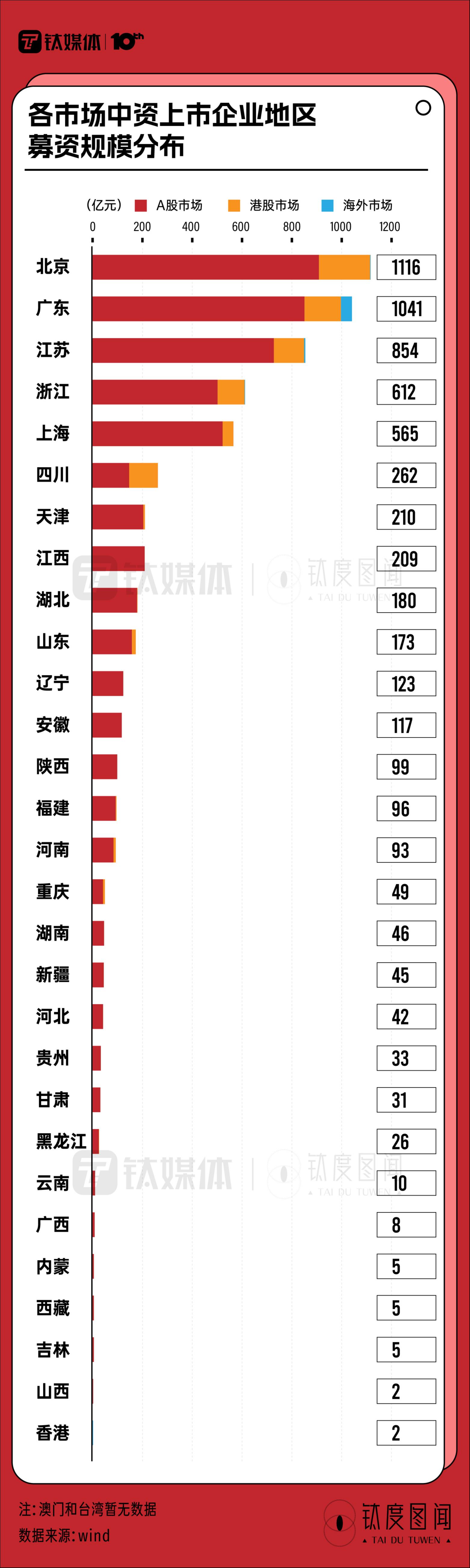 以募资额计算,北京、广东地区募资总额突破千亿,分别位列第一、第二。其中,在A股、港股市场中,均是来自北京的上市中资企业募资总额最多,分别达909亿元和205亿元;而来自广东的中资上市企业在海外市场募资总额最多,达44亿元。