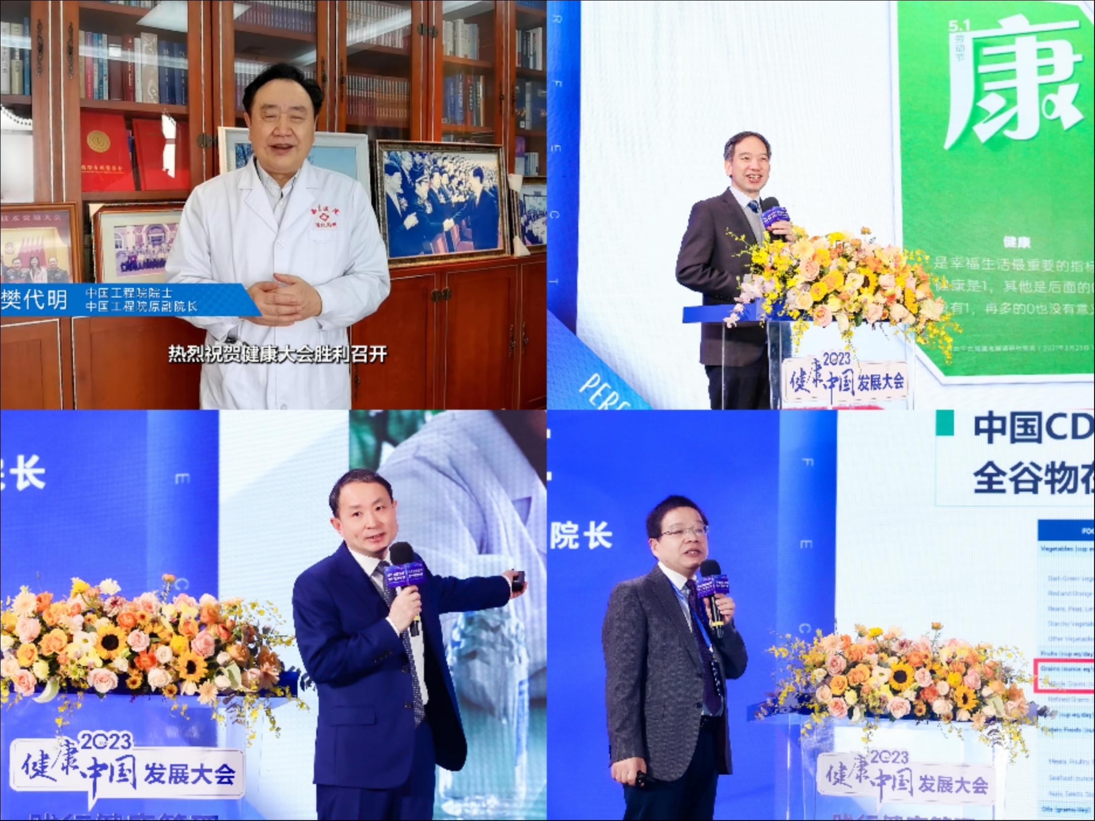 中国工程院院士、中国工程院原副院长樊代明,中国疾病预防控制中心营养与健康所所长丁钢强,浙江大学医学院附属第一医院副院长陈作兵,广东省农业科学院副院长张名位分别以《保持好心情,健康你做主》《大食物观与健康中国建设》《发酵蛋白肽粉改善老年肌少症功效及作用机制研究》《全谷物类食品的研究及健康效应》为主题发表演讲,为大家带来“完美践行健康中国2023-2025年计划”的第一堂课。他们一致认为,加强群众对健康的认识尤为重要,通过调整饮食结构、个性化精准营养干预、以保健医学改变健康思路、发展创新科技推动健康产业对健康中国建设有重要作用。