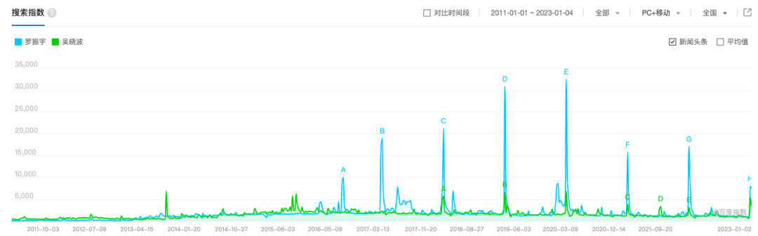 从搜索指数看,罗振宇和吴晓波都经历了“爆火”到逐渐“退烧”的周期。数据显示,2023年的热度明显不如往昔。