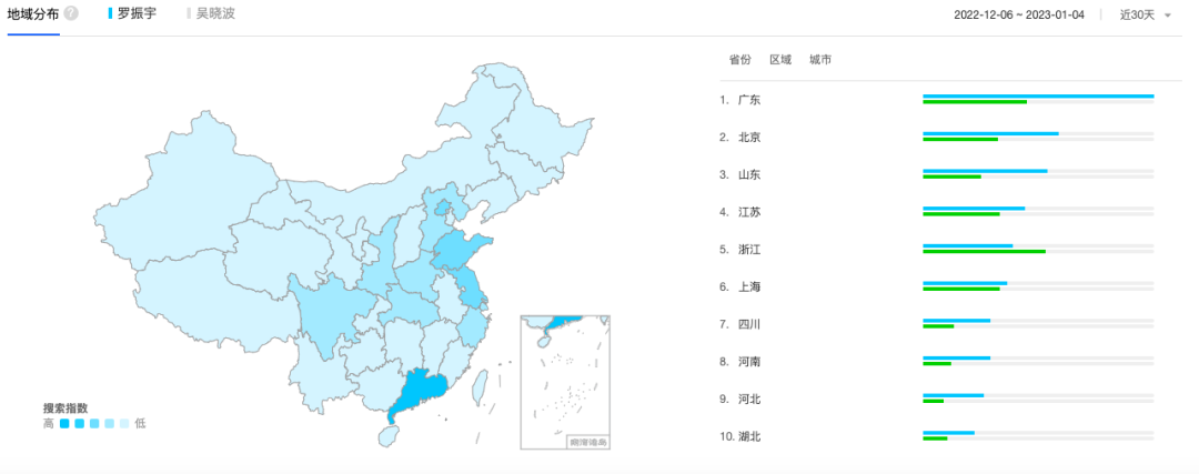 从百度指数对罗振宇和吴晓波的搜索数据来看,更多是经济发达的地方,他们对知识付费IP更感兴趣。