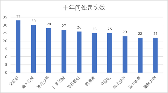 再来看承诺记录和处罚记录明细,A股近五年上市公司公开承诺记录近8万条,当前履行承诺达标率约为92.43%,十年间累计处罚8551次。其中延华智能违背承诺最多达到3次,主要是增持承诺超期未履行。处罚记录中,全新好被处罚最多达到33次,其次是勤上股份、神开股份。