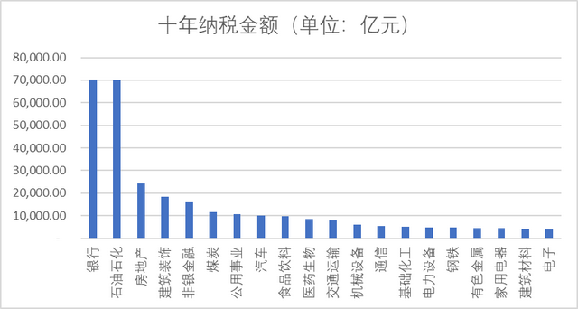 从行业层面看,近十年来纳税额最高的行业除了银行和石油石化外,房地产、建筑及非银金融排名靠前。近年来利润规模较高的互联网计算机仅排在22名。其中银行和石油石化行业纳税额均突破7万亿大关。