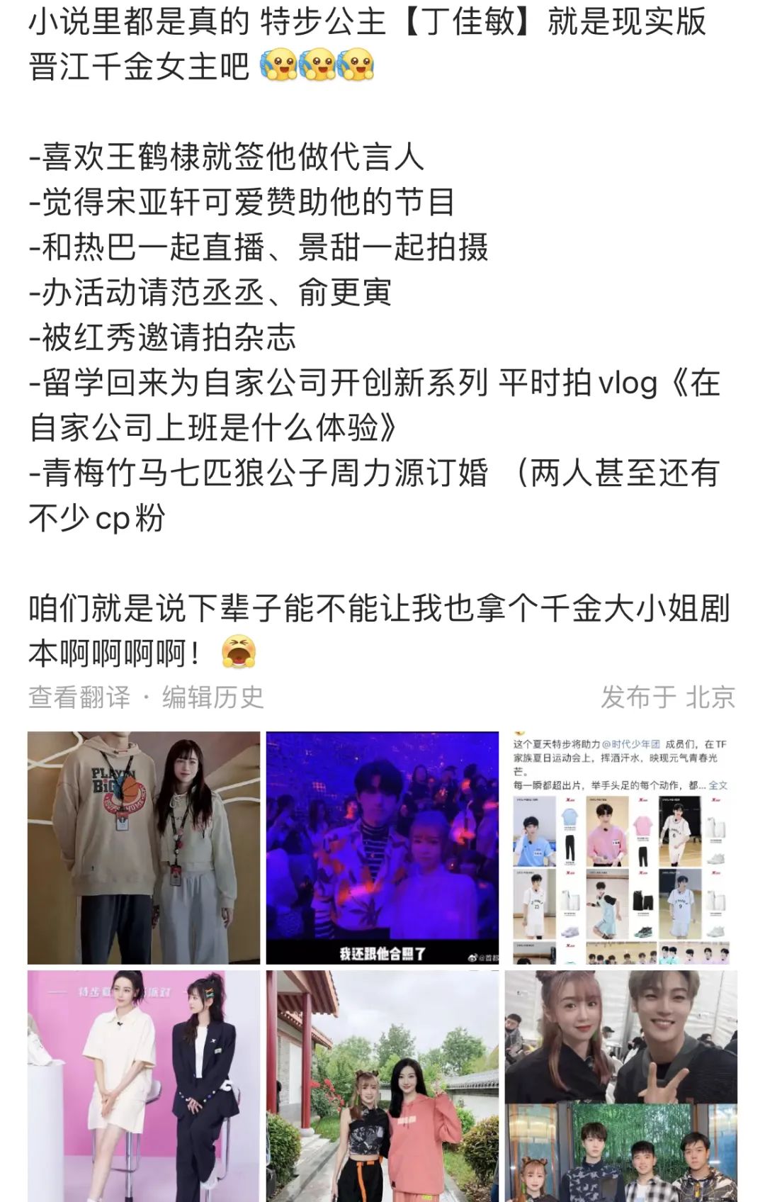 去年9月,特步董事长丁水波的小女儿丁佳敏和七匹狼创始人周少雄之子周力源高调订婚,一时被戏称“有钱人终成眷属”。比起讨论资本的联姻,网友们更愿意磕糖。两人不仅收获了数量众多的CP粉,还不时上传情侣日常,为大家脑补的晋江爱情故事增添细节,最重要的是把品牌顺带也宣传了。