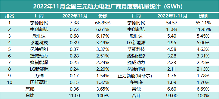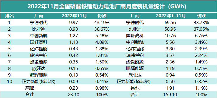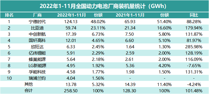 与2021年的榜单相比,前四名位置并未发生变化,宁德时代、比亚迪、中创新航、国轩高科的地位稳定,比亚迪与宁德时代相比,份额差距有所缩小。