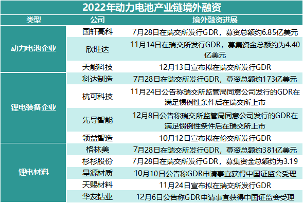 据不完全统计,目前成功在海外通过发行CDR(存托凭证)成功上市的包括国轩高科、欣旺达两家电池企业,此外还有材料和装备企业格林美、杉杉股份和科达制造。