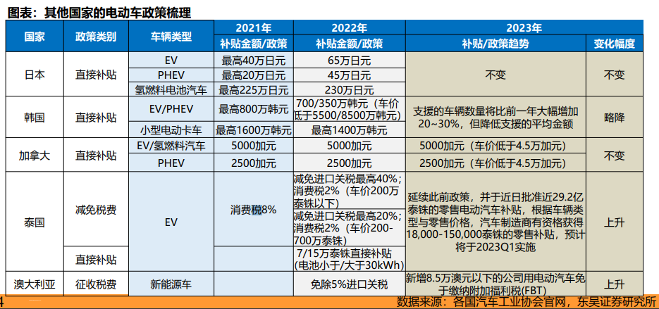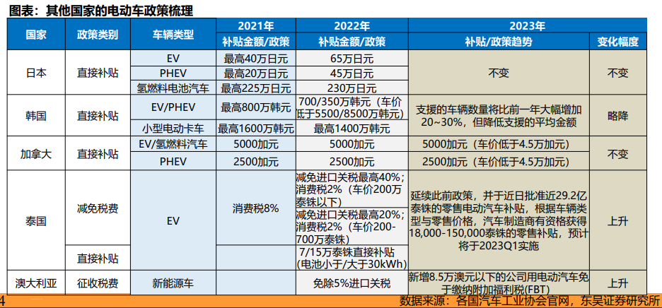 而以泰国、韩国等为例的亚太地区国家,2023年还将延续优惠政策。其中,泰国宣布23年新推出29.2亿泰铢车企补贴,以推动本土电动车制造业,电动汽车制造商有资格获得1.8-15万泰铢的零售补贴;澳大利亚2023年免除福利税和进口关税;日本延续2022年以来的直接补贴政策,且相比2021年呈上涨趋势;韩国补贴出现小幅下降。