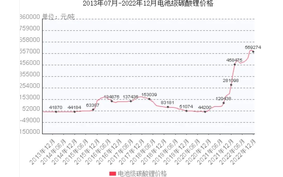 也就是说,与2020年相比,电池级碳酸锂价格在两年内暴涨逾十倍。