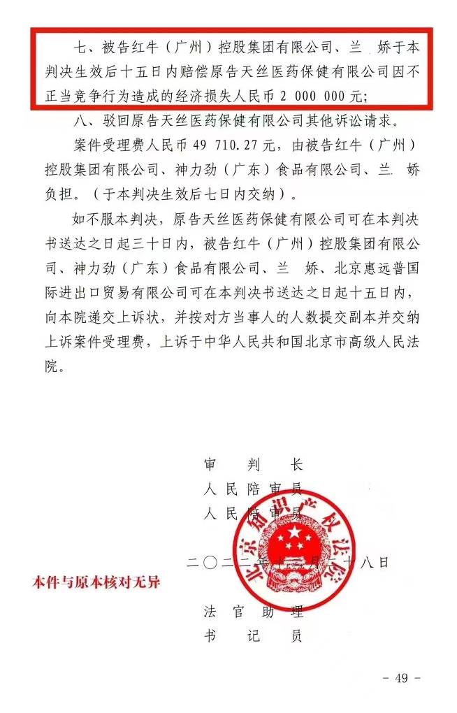 天丝集团还强调:“被告的侵权行为和不正当竞争行为极大扰乱了市场秩序,损害了原告的合法权益,如不及时制止被告的上述行为,将会对社会造成更为危害的后果,甚至可能瓦解消费者对红牛品牌的信任。”