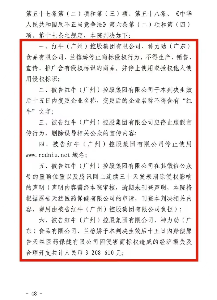 1,红牛(广州)控股集团及其生产、销售商停止商标侵权行为,不得生产、销售、宣传、推广含有侵权标识的商品;2,判决红牛(广州)控股集团不得使用含有“红牛”字样的企业名称;3,判决红牛(广州)控股集团等三被告连带赔偿天丝公司经济损失及合理开支合计500余万元。