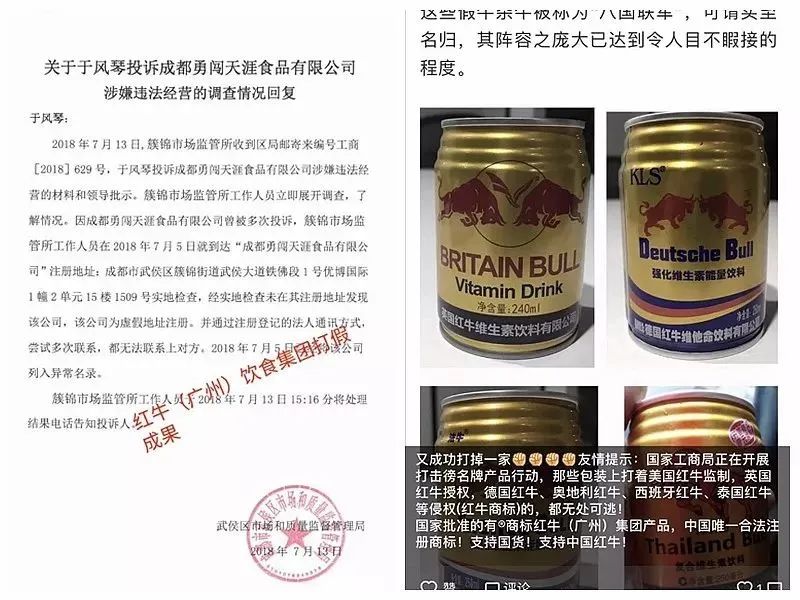 更耐人寻味的是,“广州红牛”竟然还一度在市场上高调“打假”。据统计,2018年前后,将德国红牛、奥地利红牛、西班牙红牛、泰国红牛等“洋牛”一一打掉。据知情人士回忆,彼时“让这些红牛杂牌军万万没想到的是,出手灭他们的竟然是这个和天丝红牛、华彬红牛没有半毛钱关系的红牛(广州)饮食集团。”