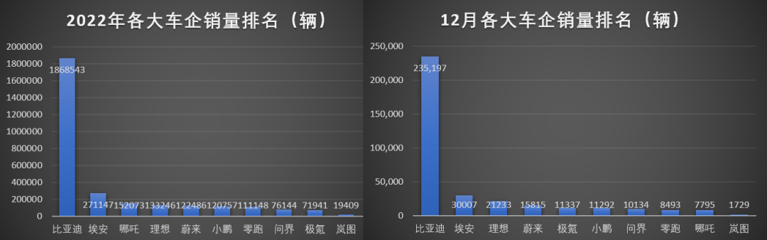 同时,埃安作为一个传统车企打造的新能源汽车新品牌,也是在2022年真正达成了对造车新势力的绝对优势。