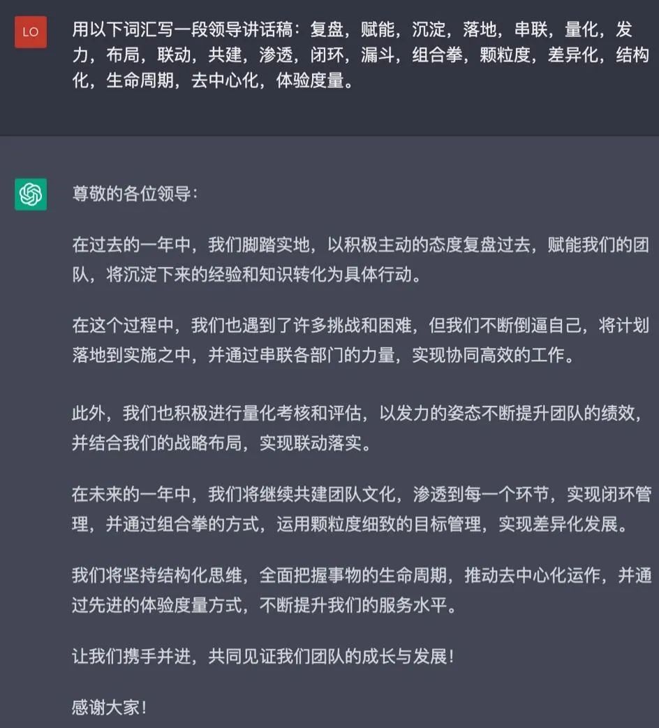 公众号“刘言飞语”的主理人刘飞也曾用ChatGPT写过一篇关于“互联网黑话”的领导演讲稿,“领导味儿”和“黑话感”都很足。