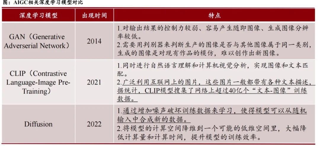在深度学习模型的迭代上,AIGC最早出现的深度学习模型为“对抗生成网络”GAN,尽管曾被称为“21世纪最强大的算法模型之一”,但也存在着生成图像分辨率较低、新图像创意不足等问题。而诞生于2021年的CLIP模型由于能够同时进行自然语言理解和计算机视觉分析,实现图像和文本匹配,也为后续AIGC应用的落地打下了基础。