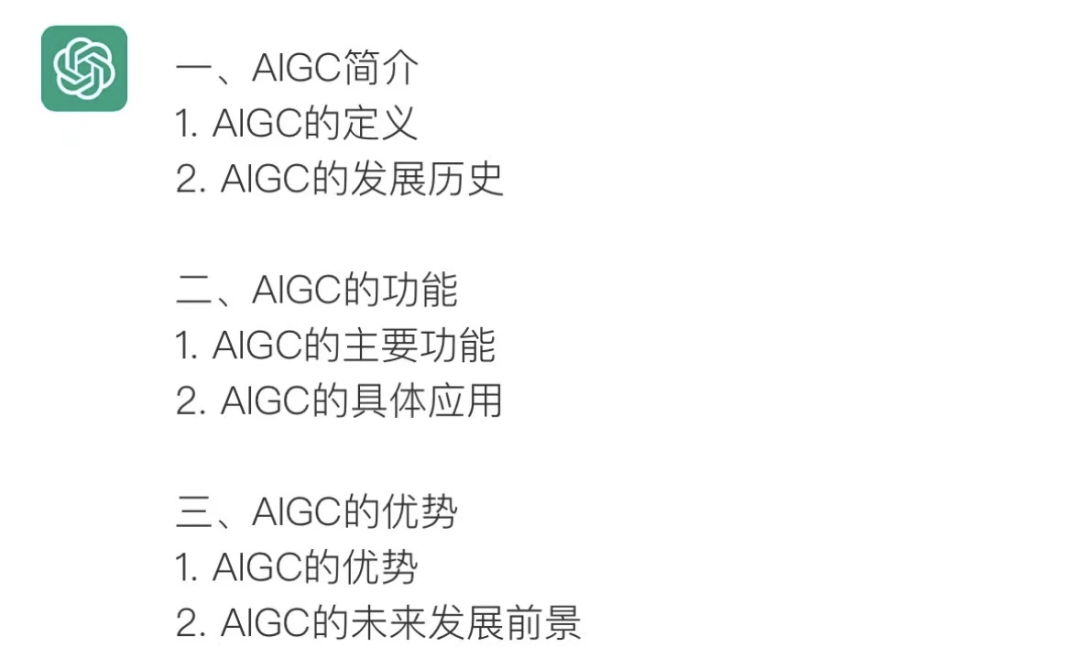 比如,“写一篇关于AIGC的稿件提纲”——ChatGPT的回复已经包含了关于AIGC的大部分关键内容。