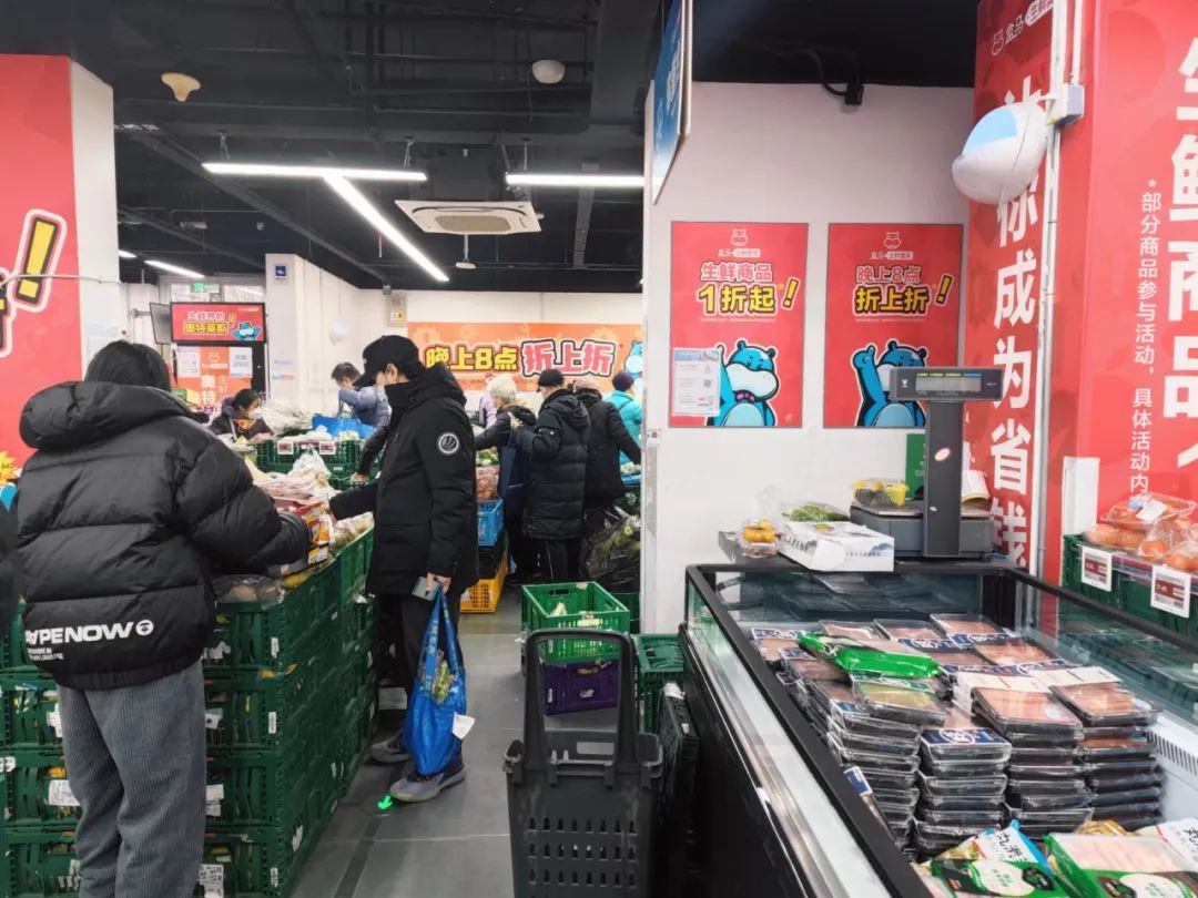 2023年1月9日下午4点30分,我们抵达了位于太阳宫地铁站附近的盒马奥特莱斯。门店面积很小,远小于盒马生鲜,也比不上盒马mini宽敞,以生鲜商品为主,有少量牛奶、面包、冷冻食品和休闲零食。
