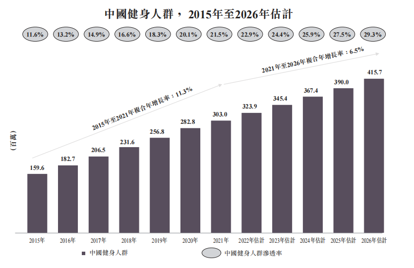 中国的健身人群(即每周参与两次以上健身活动的人士)于2021年为3.03亿,预计到2026年将达到4.16亿,2021年至2026年的复合年增长率为6.5%。