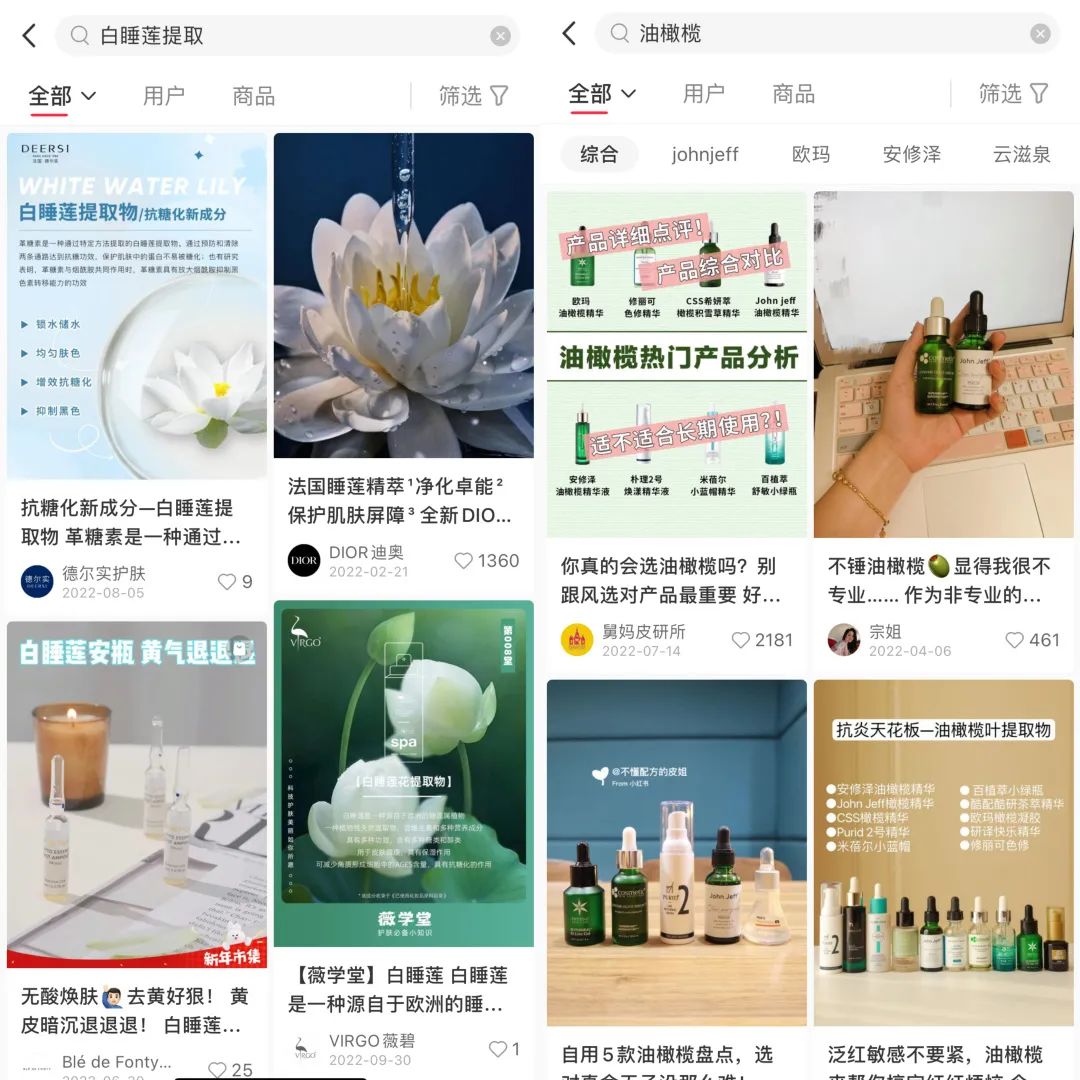 小红书上关于白睡莲和油橄榄成分的帖子