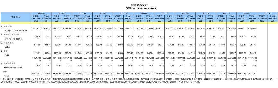 2022年1-11月中国官方储备资产(第一行为外汇储备)