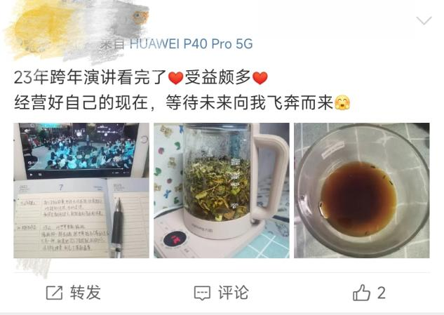 有网友表示:"每年的跨年演讲,都要听好几遍,还要做笔记。"还有网友表示:"23年跨年演讲看完了,受益颇多,经营好自己的现在,等待未来向我飞奔而来。"
