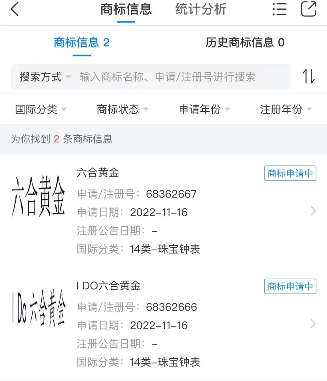 而南希透露的北京鸿轩堂品牌管理有限公司,据天眼查显示成立于2021年3月,其商标注册信息显示已于2022年11月16日分别申请了六合黄金和I DO六合黄金两个商标,其他与I Do及恒信玺利间的联系暂未看到。