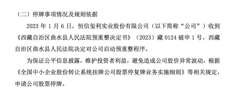 1月4日,I Do关联公司恒信玺利实业股份有限公司(以下简称“恒信玺利”)被申请破产重整,申请人为北京艾贝利特服装服饰有限公司,经办法院为西藏曲水县人民法院。目前法院决定对公司启动预重整,恒信玺利股票从1月9日起停牌。