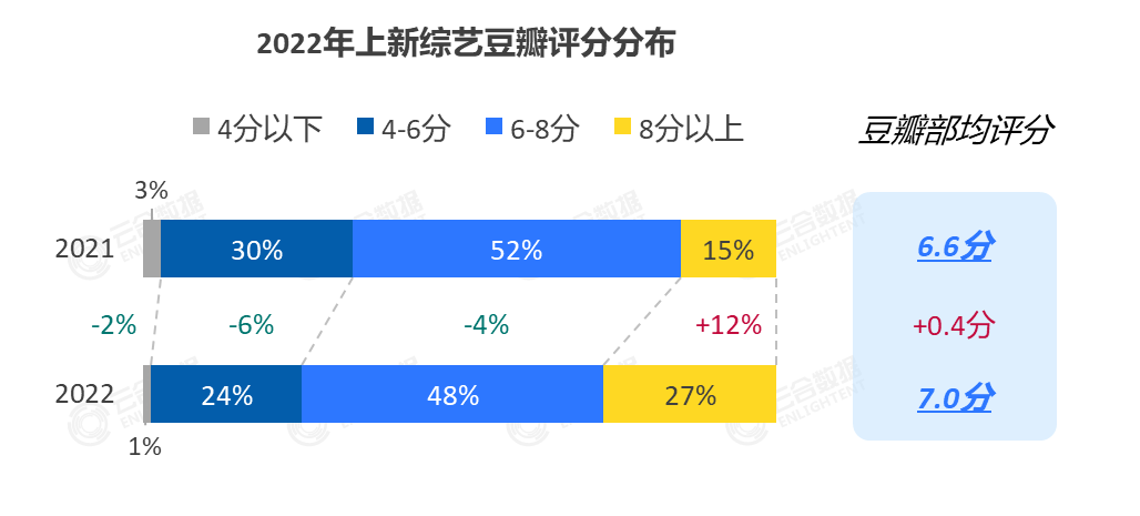 2022年,综艺市场虽然出现一定程度的收缩,但“减量”相对应的是“提质”,年度内多档综艺口碑不俗。云合数据显示,2022年上新的国产综艺豆瓣均分达到7分,其中,8分以上的作品占比达到27%,较上年同期增长12%。