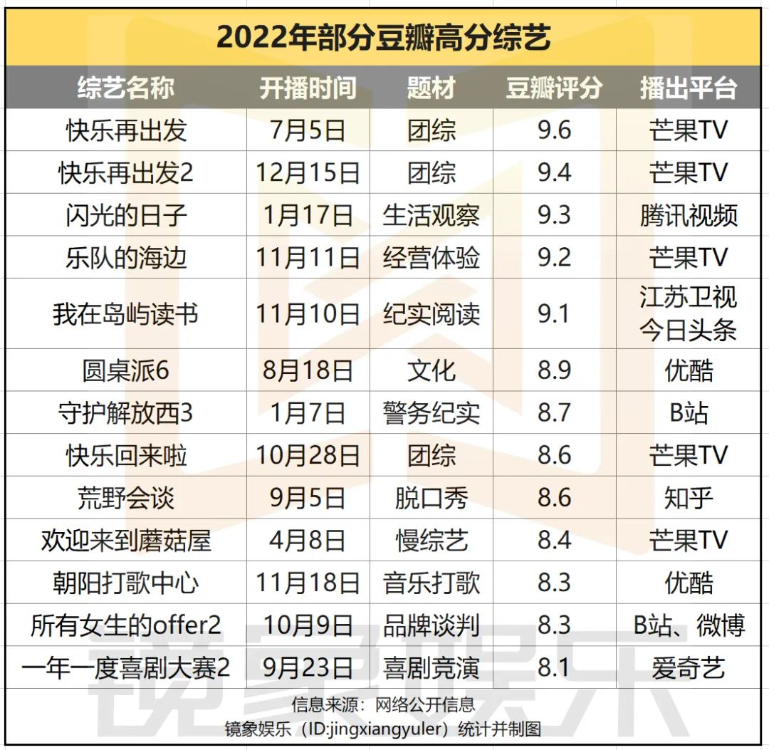 除了高分综艺频出外,更值得关注的是,在这些高分内容中,不少都是今年开播的新节目。其中,《快乐再出发》系列、《闪光的日子》《我在岛屿读书》等豆瓣评分都达到9分以上。且在题材分布上,高分综艺覆盖到经营体验、生活纪实、文化、音乐、喜剧等多个品类。多赛道内容品质集体走高,对综艺市场发展也是一个积极的信号。