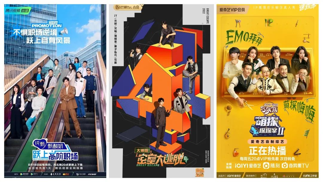 2022年,腾讯视频在《令人心动的offer》之外,携原团队开发新职场综艺《跃上高阶职场》,通过聚焦轻熟龄职场人形成差异化;芒果TV的重要IP《密室大逃脱》,衍生的《密室大逃脱大神版》也上线至第四季。同在推理赛道,爱奇艺的《萌探探探案2》、腾讯视频的《开始推理吧》等也相继进入大众视野。
