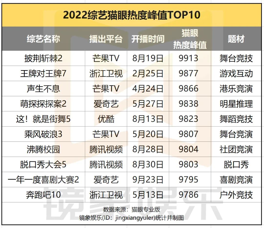 综艺市场的阶段性变化,使得行业资源进一步向头部内容集中。在这样的发展态势下,综N代作为被市场验证过的内容,各平台也更着力布局。据镜象娱乐统计,2022年,按猫眼热度峰值计,TOP10的综艺中有8部都是综N代作品。