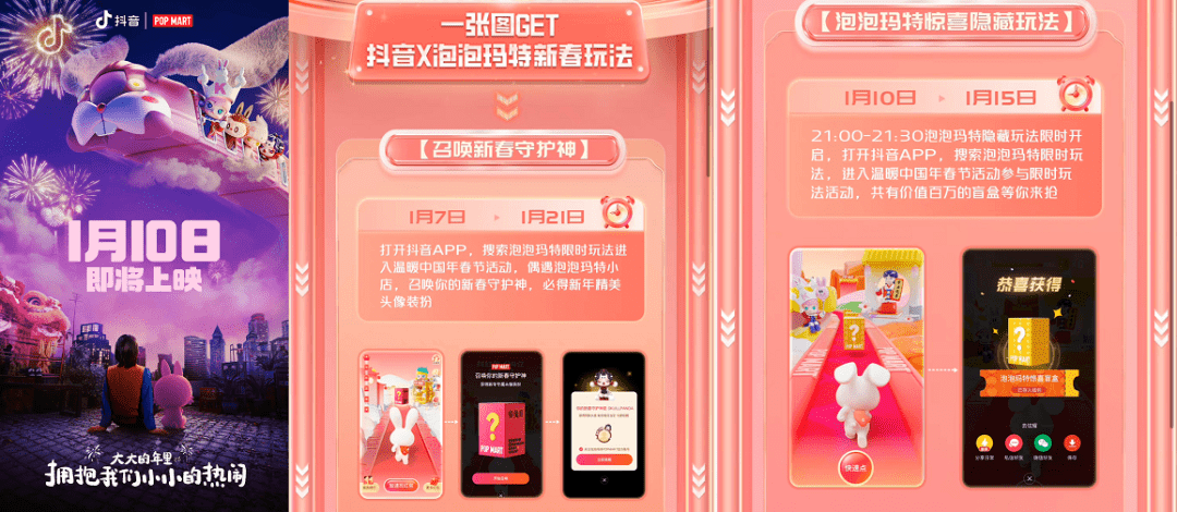 而在“上抖音,召唤你的新春守护神”新春活动里,潮玩用户可以进入抖音APP领取电子版的新春守护神玩具,还可通过兔子奔跑游戏抢盲盒、猜灯谜、抢精美头像装扮等,并有机会得到实体盲盒奖励。从各个层面来看,这都是一场双赢的联动营销。